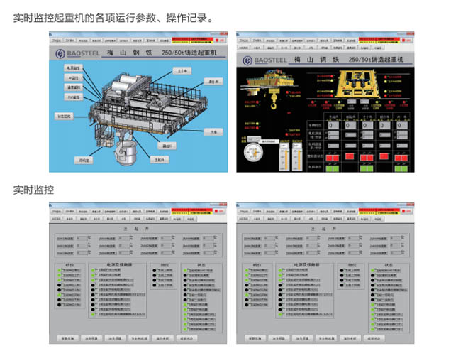 •-1、起重機狀態(tài)實時監(jiān)測:對事故易發(fā)設(shè)備和重點關(guān)鍵設(shè)備的運行情況進行實時監(jiān)測,同時 對采集的數(shù)據(jù)進行分析整理,并把現(xiàn)場的實際數(shù)據(jù)與相關(guān)的設(shè)備運行指標(biāo)進行對比,超過偏 差限制時產(chǎn)生報警信息并存儲報警記錄。共享相關(guān)數(shù)據(jù),為及時發(fā)現(xiàn)和消除設(shè)備故障隱患提 供必要的數(shù)據(jù)支持。