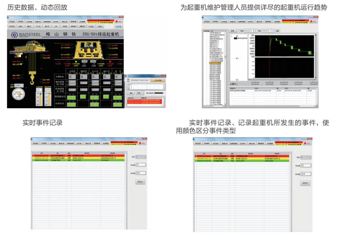 •- 通過起重機安全監(jiān)控管理系統(tǒng),運行管理人員可以通過系統(tǒng)對起重機運行中出現(xiàn)的故障進行 查詢和處理;對設(shè)備及元器件進行系統(tǒng)管理;指導(dǎo)定期對系統(tǒng)進行維修和調(diào)試。系統(tǒng)具備以 下功能:實時狀態(tài)顯示、實時報警顯示、歷史記錄查詢、部件壽命監(jiān)測、事故診斷分析、數(shù) 據(jù)統(tǒng)計及權(quán)限設(shè)定管理等。