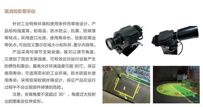 1、區(qū)域警示系統(tǒng):在行車小車底部增加一臺工業(yè)警示儀,投影到行車吊鉤下方6米范圍內作為警戒區(qū)、4米范圍內作為危險區(qū)(警示區(qū)域可自行設定區(qū)域范圍大小及圖像形狀和文字內容)