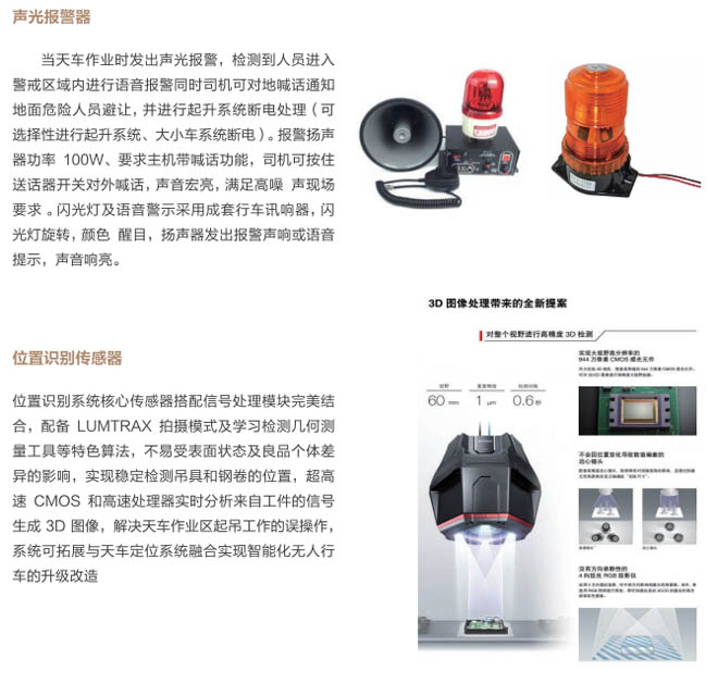 5、位置識別系統(tǒng):采用定位及位置識別最新技術,通過圖像識別傳感器,識別鋼卷和吊具的位置,進行計算和分析判斷吊具與鋼卷具備吊掛和起吊條件,進行語音提示,系統(tǒng)具有自動識別跟蹤鋼卷與吊具的距離,操作工實時掌握清晰的位置及畫面信息,準確無誤的操作,與天車定位系統(tǒng)拓展能達到自動起吊,最終實現(xiàn)智能化、無人化行車的升級改造。該系統(tǒng)能極大的減少操作人員的誤操作,給生產(chǎn)及安全提供有力保障,提高生產(chǎn)效率及設備安全性。
