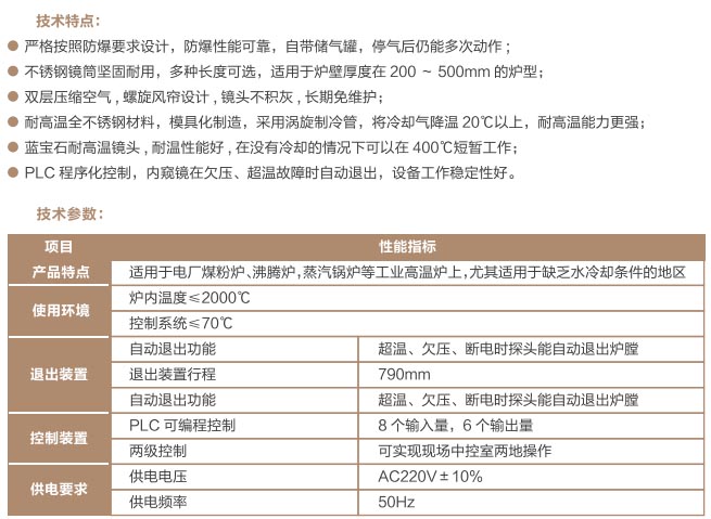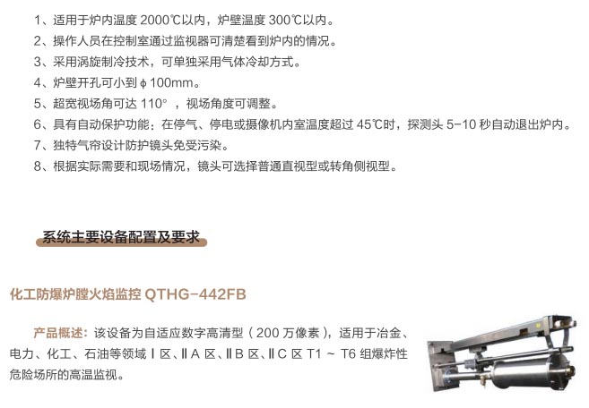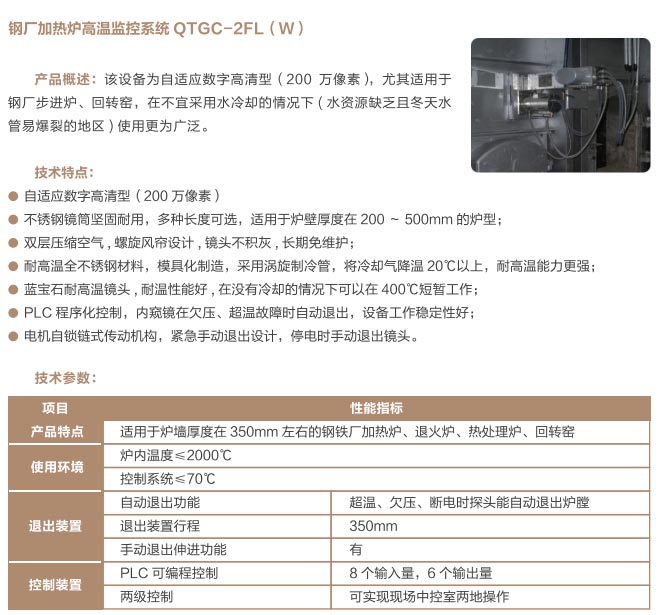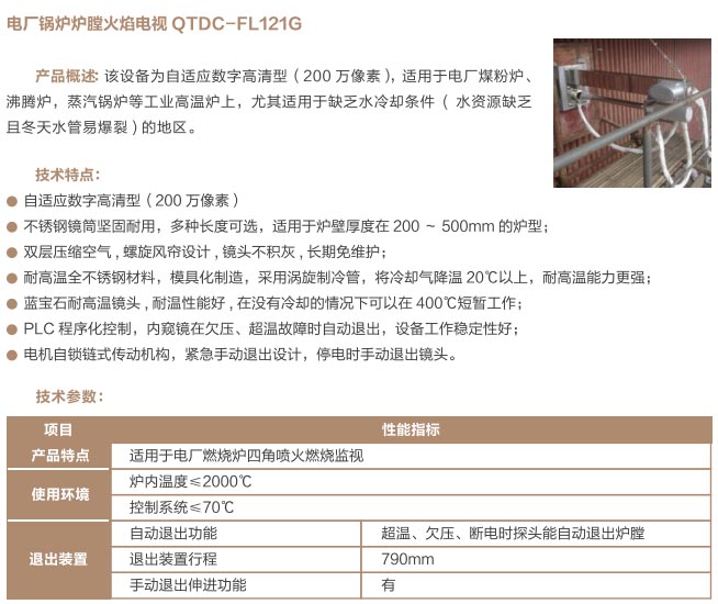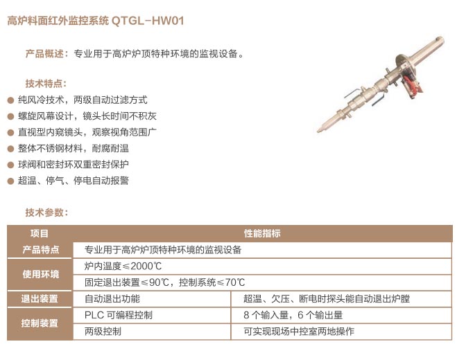 爐窯高溫監(jiān)測監(jiān)控系統(tǒng)是專為工業(yè)高溫爐窯監(jiān)測監(jiān)控的設(shè)計的智慧管理平臺,是針對爐壁開孔和爐窯視像有嚴(yán)格要求的高溫爐窯而研制的高溫工業(yè)電視。利用特種高溫孔式光學(xué)鏡頭,鏡頭設(shè)計采用中繼物鏡,兩次成像系統(tǒng),使像面在遠(yuǎn)離觀察孔的CCD靶面上形成,最大限度的減少進入攝像機的熱輻射,致力為冶金、電力、建材、礦山、化工等行業(yè)服務(wù)。我公司研發(fā)主導(dǎo)產(chǎn)品已擁有第三代SG內(nèi)窺式高溫工業(yè)電視系列、爐壁式高溫工業(yè)電視系列、內(nèi)窺式拐角高溫工業(yè)電視系列、鍋爐汽包水位電視系統(tǒng)等成套設(shè)備,以及各種風(fēng)冷防護罩,水冷防護罩,渦旋制冷防護罩等工業(yè)監(jiān)控設(shè)備配套產(chǎn)品。產(chǎn)品廣泛應(yīng)用于鋼鐵廠加熱爐、退火爐,電廠鍋爐爐膛火焰、水泥廠回轉(zhuǎn)窯窯頭看火、篦冷機看料、玻璃廠玻璃熔窯等特殊高溫環(huán)境。幫助用戶進行工業(yè)爐實時電視監(jiān)測及控制,解決設(shè)備的運行故障等,對用戶改善產(chǎn)品質(zhì)量、降低成本、安全生產(chǎn)有著獨特的成效。受到了用戶的一致好評。